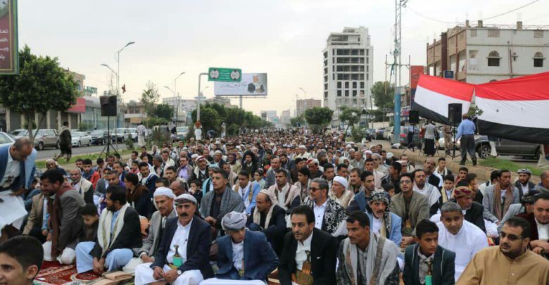 ادى موظفي شركة النفط اليمنية واللجان النقابية وجموع غفيره من المواطنين اليوم صلاة عيد الأضحى المبارك بشارع الستين امام مكتب الامم المتحدة .