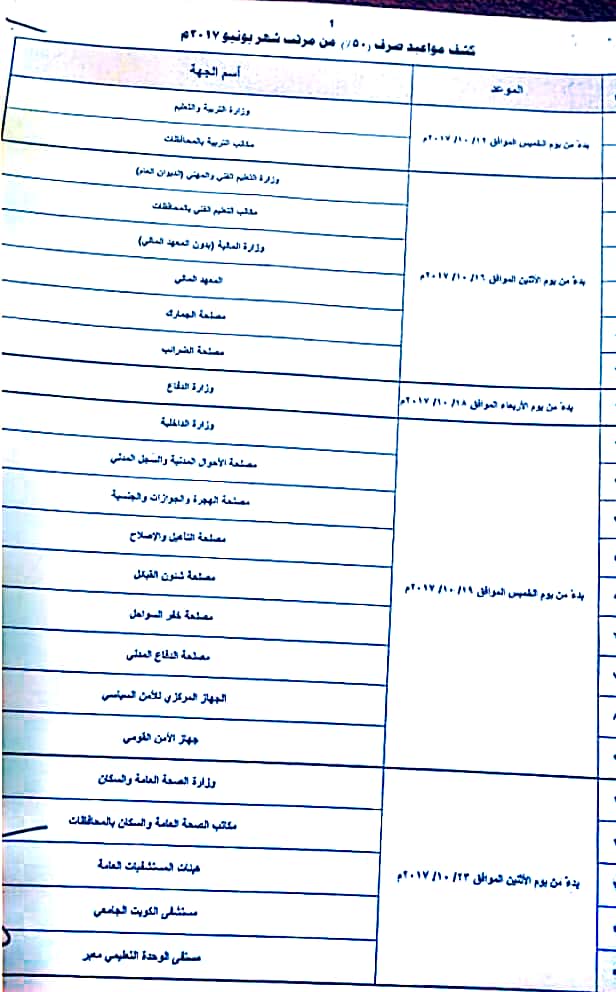 أصدرت وزارة المالية اليوم بصرف نصف مرتب لشهر يونيو للكل الجهات العسكرية وحسب الجدول الموضح بالصورة موعد كل جهة