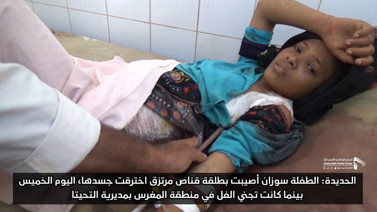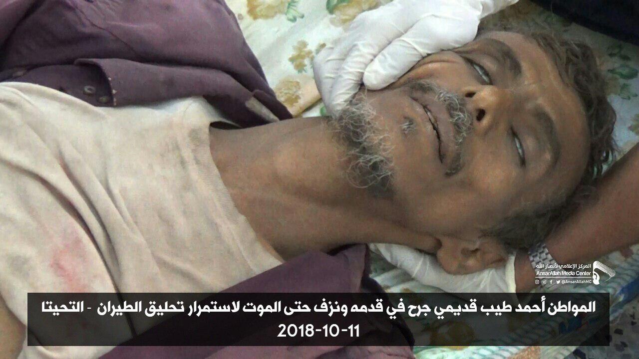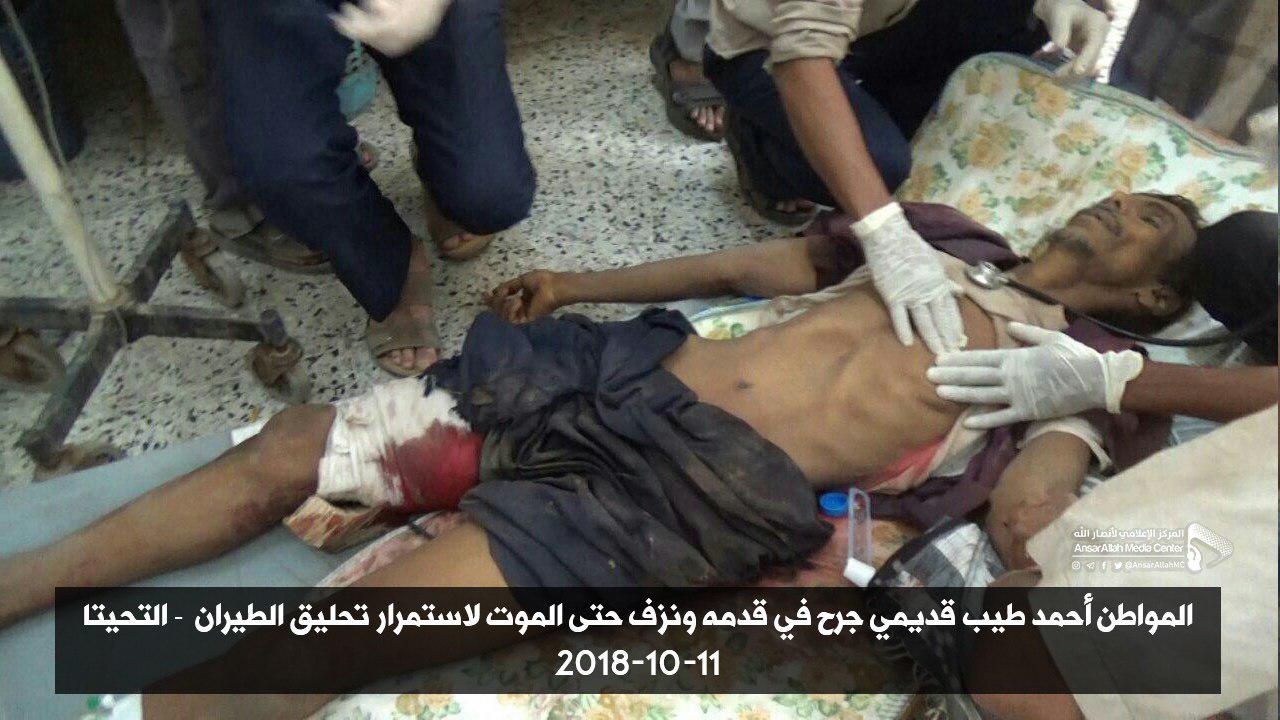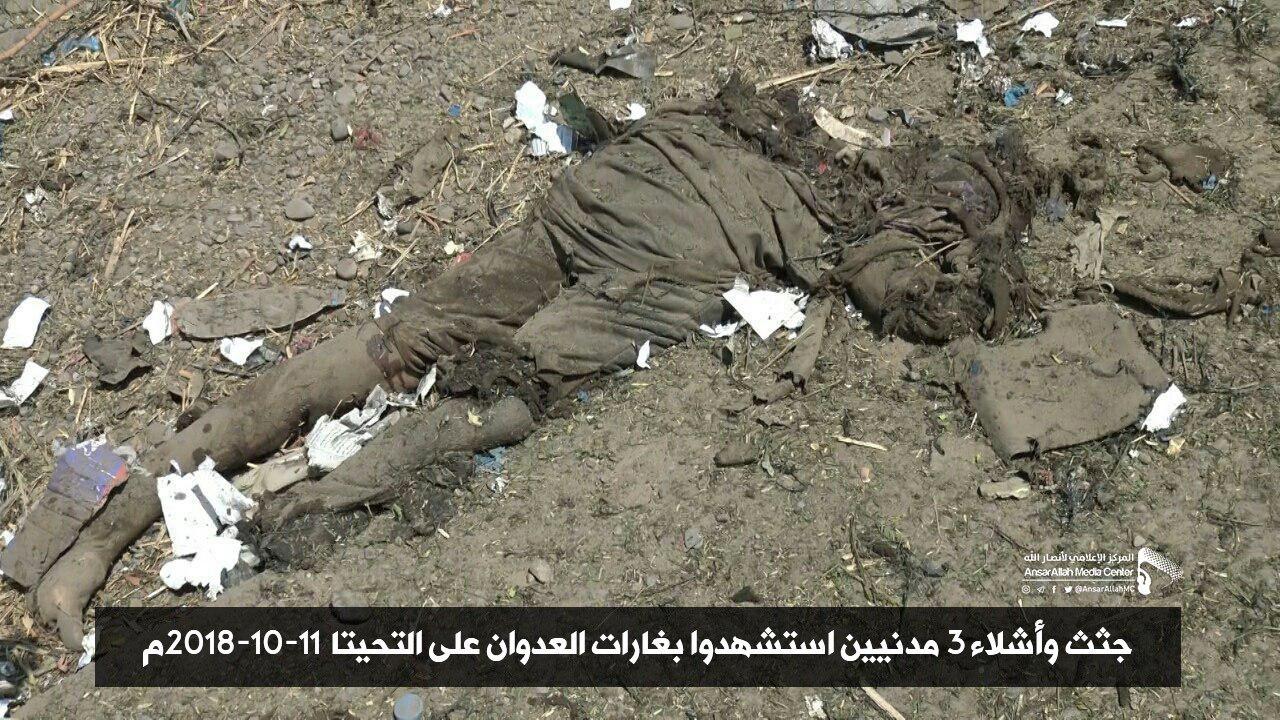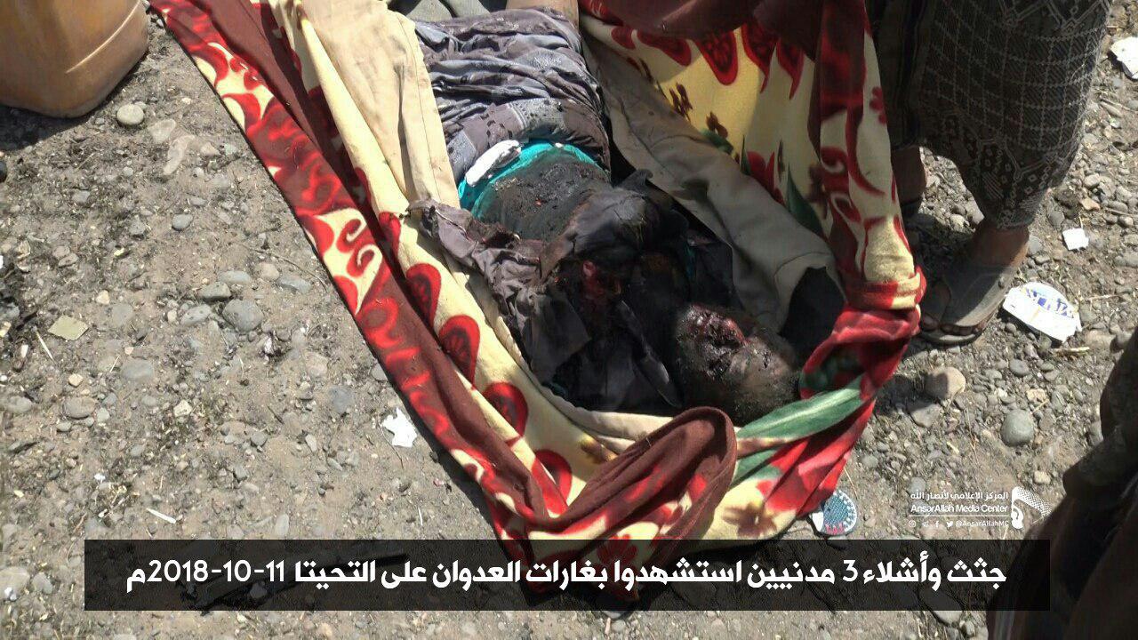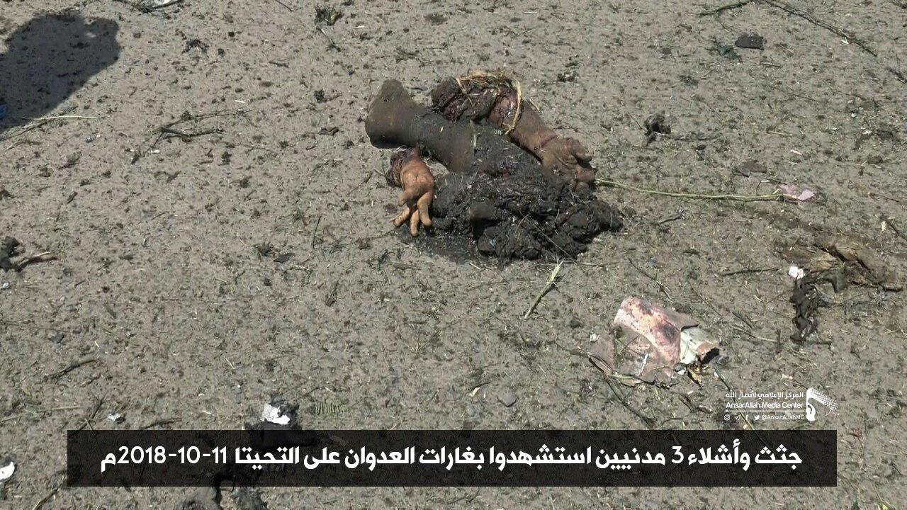 هذا ونشر المركز الإعلامي لأنصارالله، صور أولية، لما تبقى من أشلاء عدد من الشهداء، وجرحى تمكنت فرق الاسعاف من الوصول إليهم قبل أن تقوم طائرات العدوان بمنع سيارات الإسعاف التي تحاول الوصول إلى المناطق المستهدفة لإنقاذ المصابين المحاصرين في مديرية التحيتا