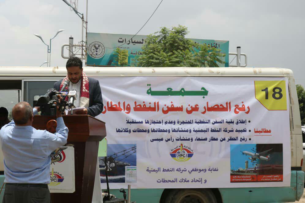 وفي الوقفة صرح الناطق الرسمي لشركة النفط اليمنية نائب مدير الدائرة التجارية الأستاذ/أمين الشباطي ، لعدد من وسائل الإعلام بضرورة التحرك الجاد والمسئول من قبل الأمم المتحدة والمجتمع الدولي بالإفراج عن بقية السفن النفطية وضمان عدم احتجاز السفن مستقبلا ، كما طالب الناطق الرسمي لشركة النفط من المجتمع الدولي القيام بواجباته وفتح الحظر عن مطار صنعاء الدولي المطار الوحيد الذي يعد من أهم المرافق الحيوية للمسافرين وانتقال المرضى للعلاج في الخارج .