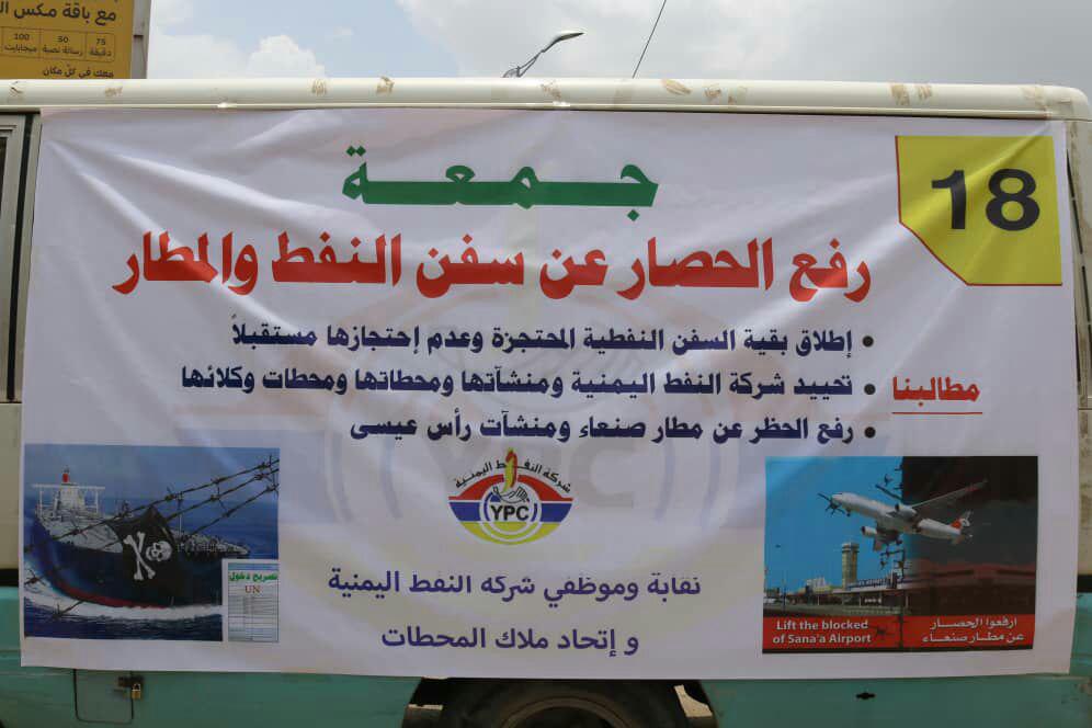 نظم موظفو شركة النفط اليمنية والنقابات والهيئات التابعة لها اليوم وقفة احتجاجية امام مبنى الامم في صنعاء عقب صلاة الجمعة ال18 تحت عنوان ( جمعة رفع الحصار عن عن السفن النفطية ومطار صنعاء الدولي ) .