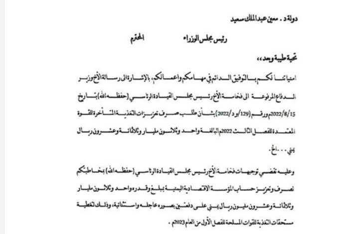 وتضمنت الوثيقة طلبًا من وزير الدفاع إلى العليمي بصرف تعزيزات التغذية المتأخرة للفصل الثالث من عام 2022 بقيمة 31 مليار ريال.