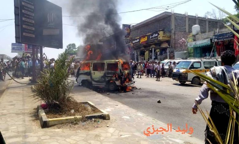 اندلع حريق داخل باص ركاب صغير اليوم الثلاثاء، بمنطقة بير باشا غرب تعز .