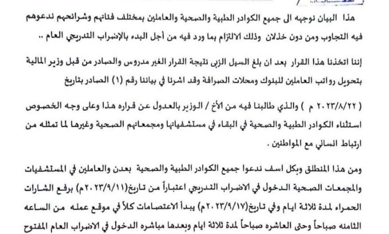 أعلنت نقابة المهن الطبية والصحية في عدن الإضراب التدريجي ورفع الشارات الحمراء ابتداء من يوم غد الإثنين احتجاجا على قرار وزارة المالية في الحكومة التابعة للتحالف.
