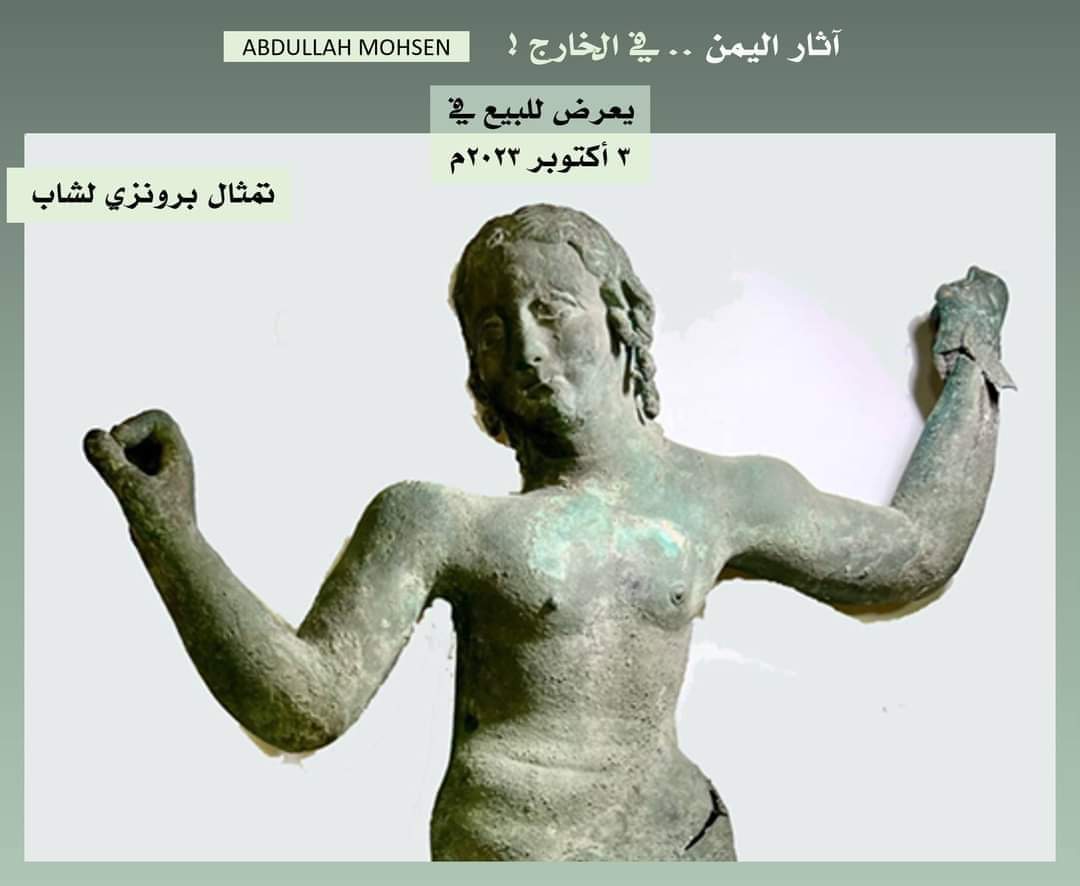 من صفحة وزير الثقافة السابق / خالد الرويشان بلادٌ في مزاد تل أبيب! مزاد في تل أبيب لبيع هذه الآثار اليمنية التي لا تُقدّر بثمن بعد عشرين يوماً! يوم 3 أكتوبر القادم ستُعرض هذه القطع في المزاد مع 11 قطعة أخرى! لن أقول أين الدولة اليمنية فهي لم تحافظ على موجوداتها وهي عندها حتى يمكن أن تستعيدها من تل أبيب؟ إنما سأرجو تجار اليمن الوطنيين الكبار أن يدخلوا في المزاد ويستعيدوا هذه القِطع وتبقى لديهم حتى يتم تعويضهم من الدولة! وفي الواقع أنهم لن يخسروا شيئا .. فهي كنزٌ أثري ووطنيٌ مهمٌ جداً.