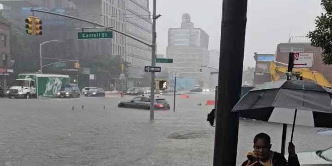 تتعرض مدينة نيويورك هذه الاثناء الآن لموجة غير مُعتادة من الأمطار الغزيرة، التي تسببت بارتفاع كبير في منسوب المياه وغرق أجزاء من المدينة.