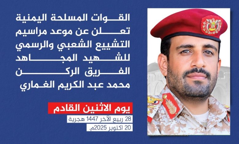 أعلنت القوات المسلحة أن مراسيم التشييع الشعبي والرسمي للشهيد المجاهد الفريق الركن محمد عبد الكريم الغماري ستكون يوم الاثنين المقبل.