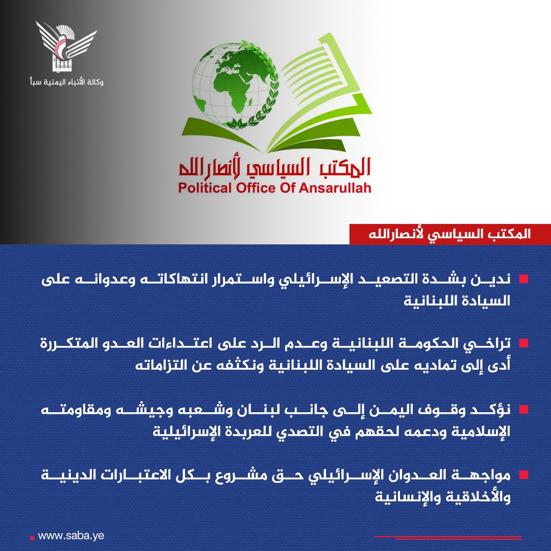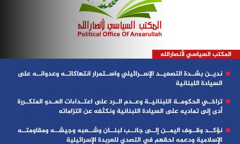 المكتب السياسي لأنصارالله: ندين بشدة التصعيد الإسرائيلي واستمرار انتهاكاته وعدوانه على السيادة اللبنانية