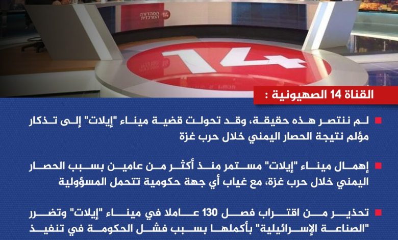 القناة 14 الصهيونية: لم ننتصر هذه حقيقة، وقد تحولت قضية ميناء “إيلات” إلى تذكار مؤلم نتيجة الحصار اليمني خلال حرب غزة