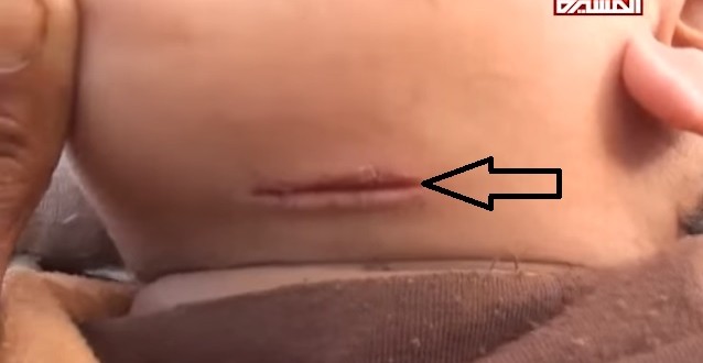 تعز | الطفل حسن وائل الكندي _ 4 سنوات _ من صبر الموادم حاول الدواعش ومرتزقة العدوان ذبحة بالسكاكين في…